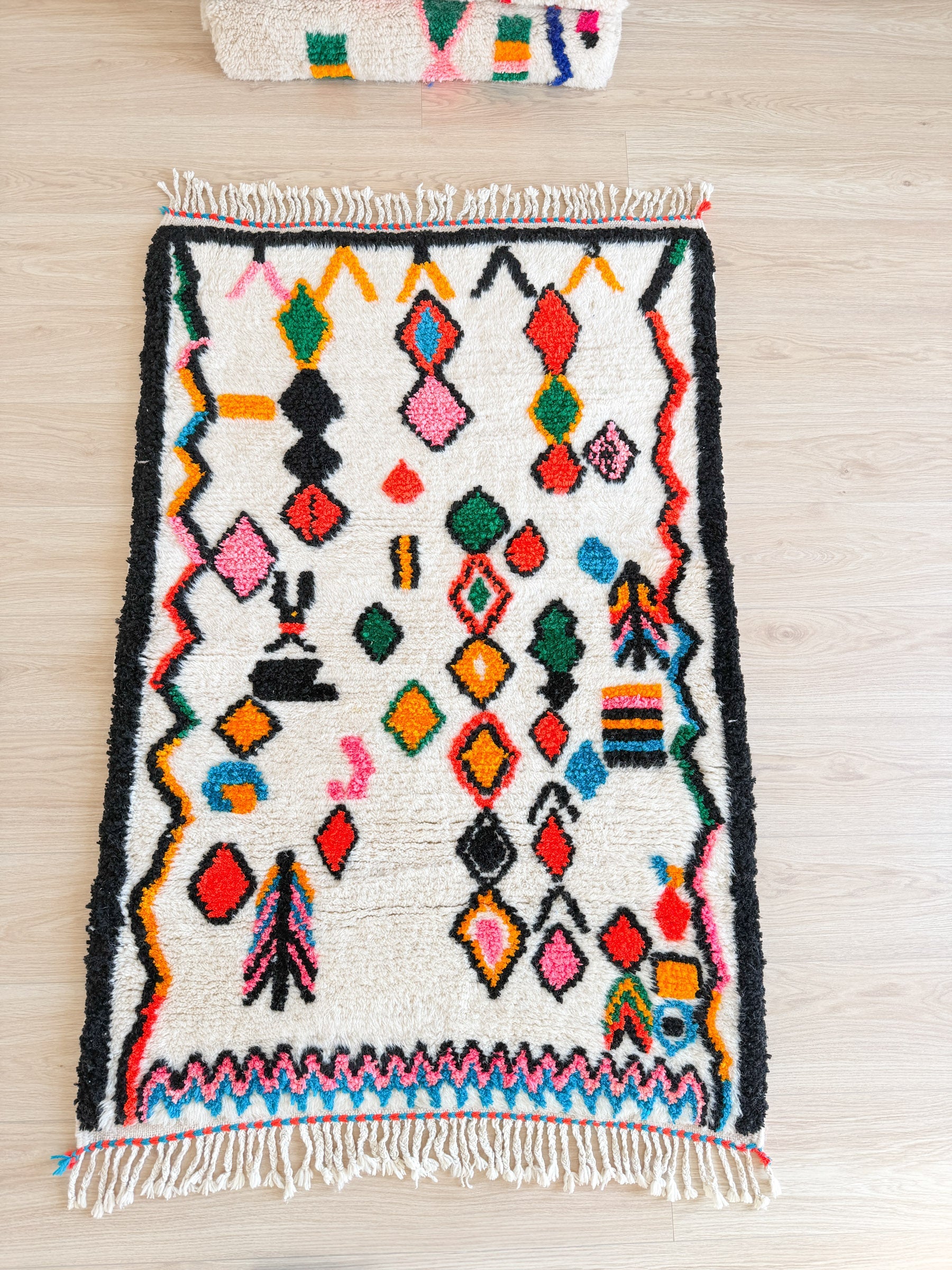 This colorful Berber rug , handmade in the Atlas Mountains, blends tradition and creativity with its unique, vibrant patterns. Crafted from natural wool and cotton, it brings a warm and inviting touch to your home. Ideal for those who appreciate bold décor, this rug reflects Moroccan craftsmanship in all its splendor.