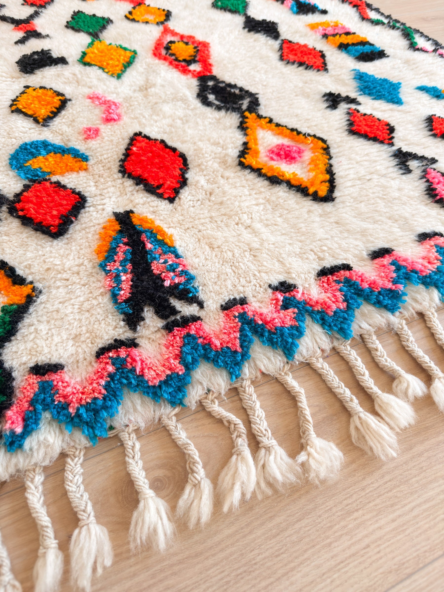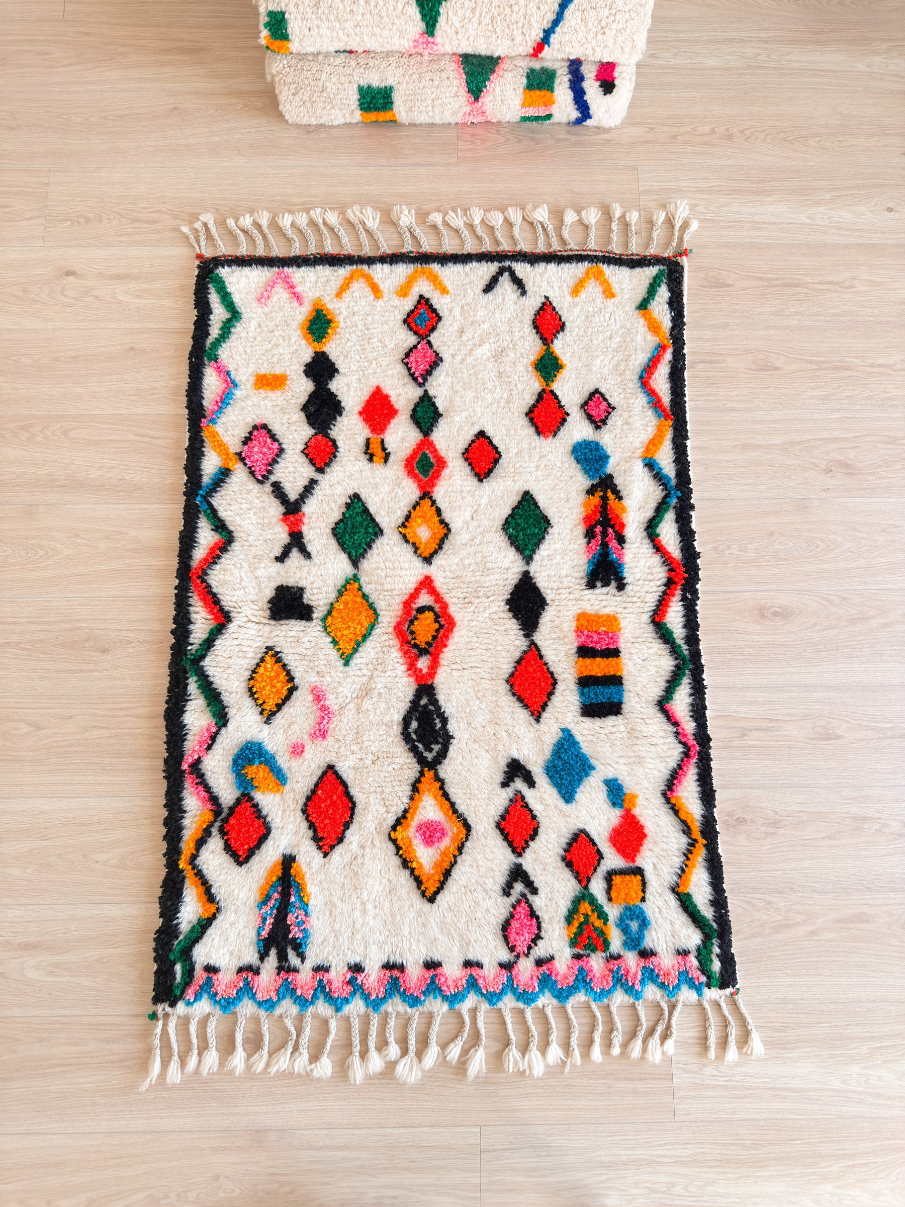 This colorful Berber rug , handmade in the Atlas Mountains, blends tradition and creativity with its unique, vibrant patterns. Crafted from natural wool and cotton, it brings a warm and inviting touch to your home. Ideal for those who appreciate bold décor, this rug reflects Moroccan craftsmanship in all its splendor.